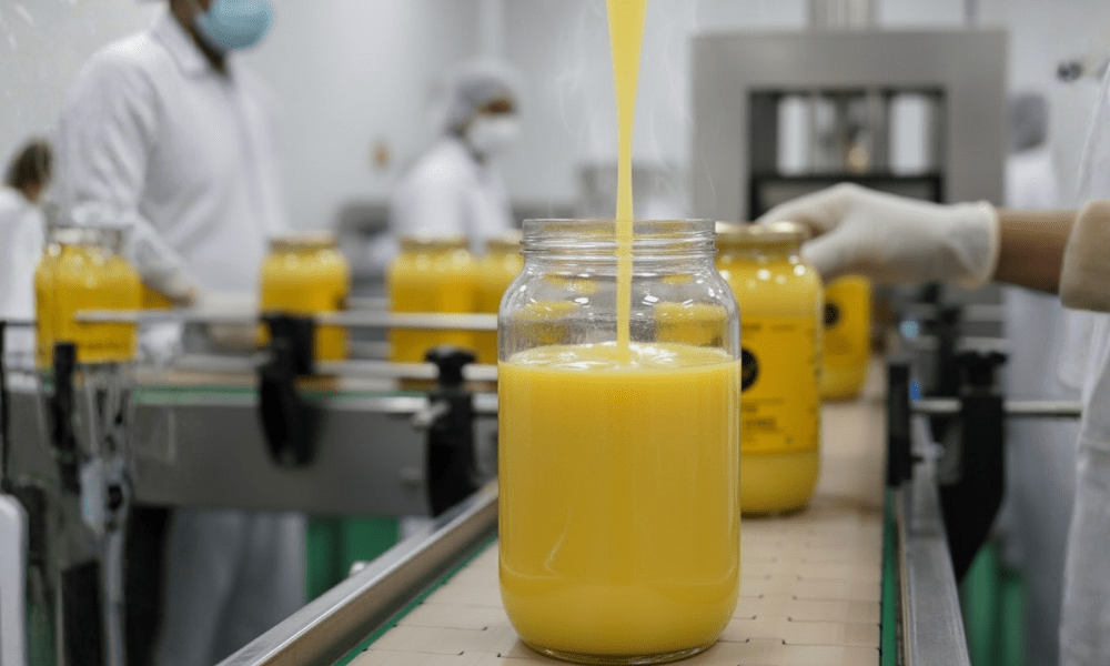 The freshly prepared golden ghee is carefully poured into sterilized glass jars, preserving its natural flavour and fragrance.