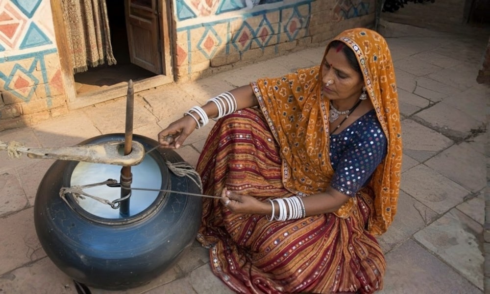 The curd is churned using the traditional Bilona method to extract pure, golden butter.