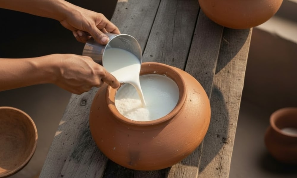 Fresh milk is naturally fermented to set into curd, forming the base for authentic ghee.