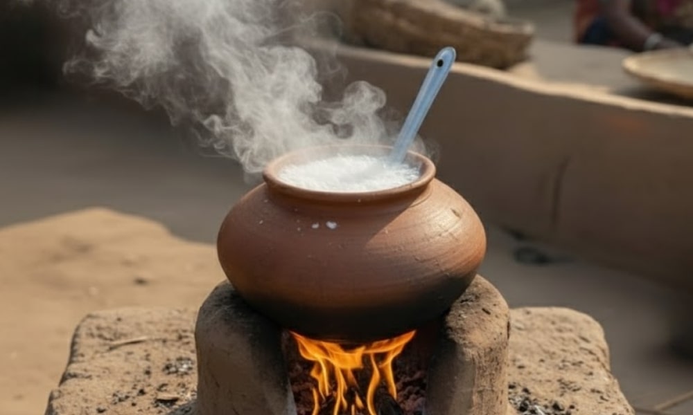 The milk is slowly boiled in clay pots over a wood fire, removing impurities and enhancing flavor.
